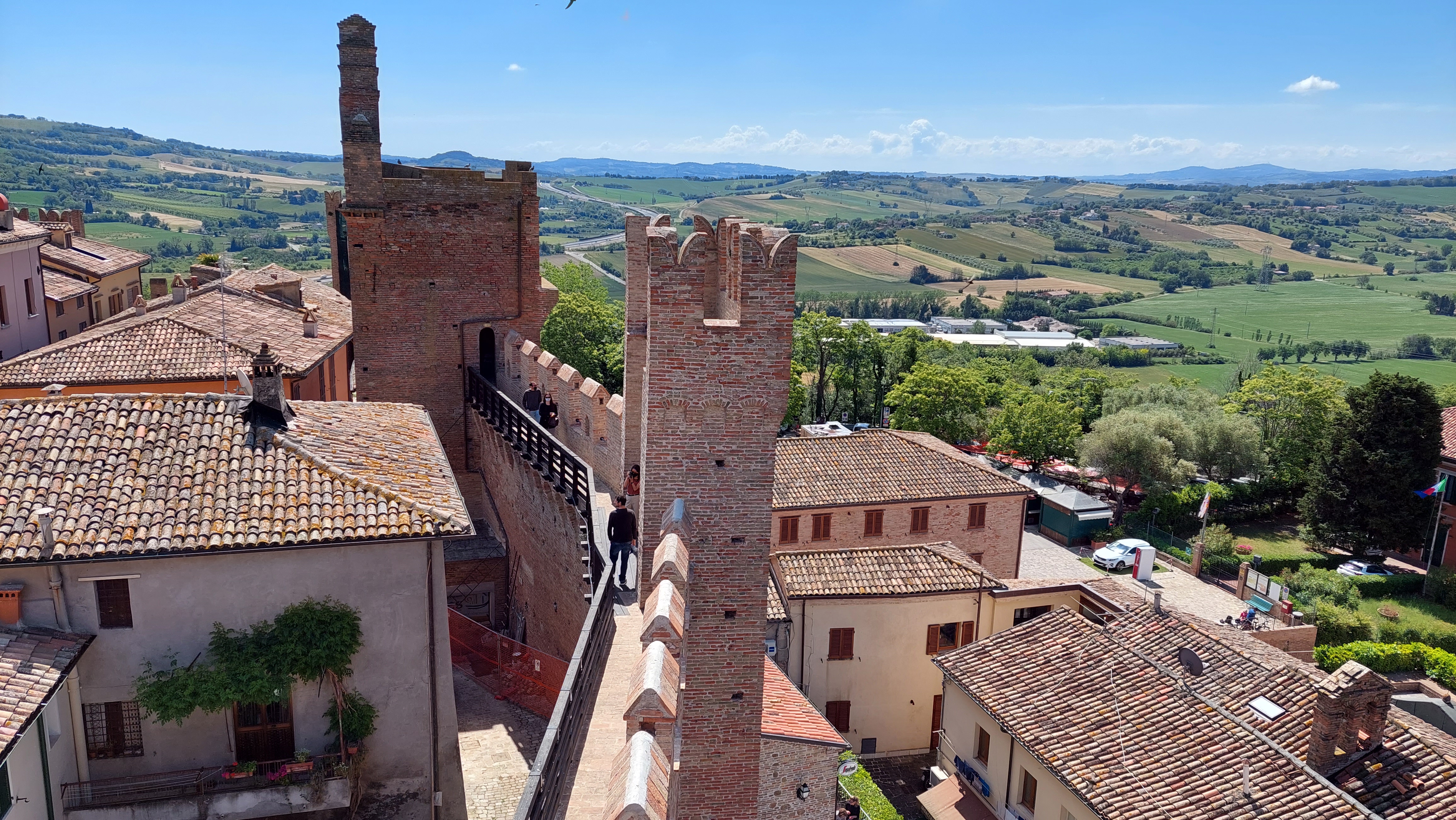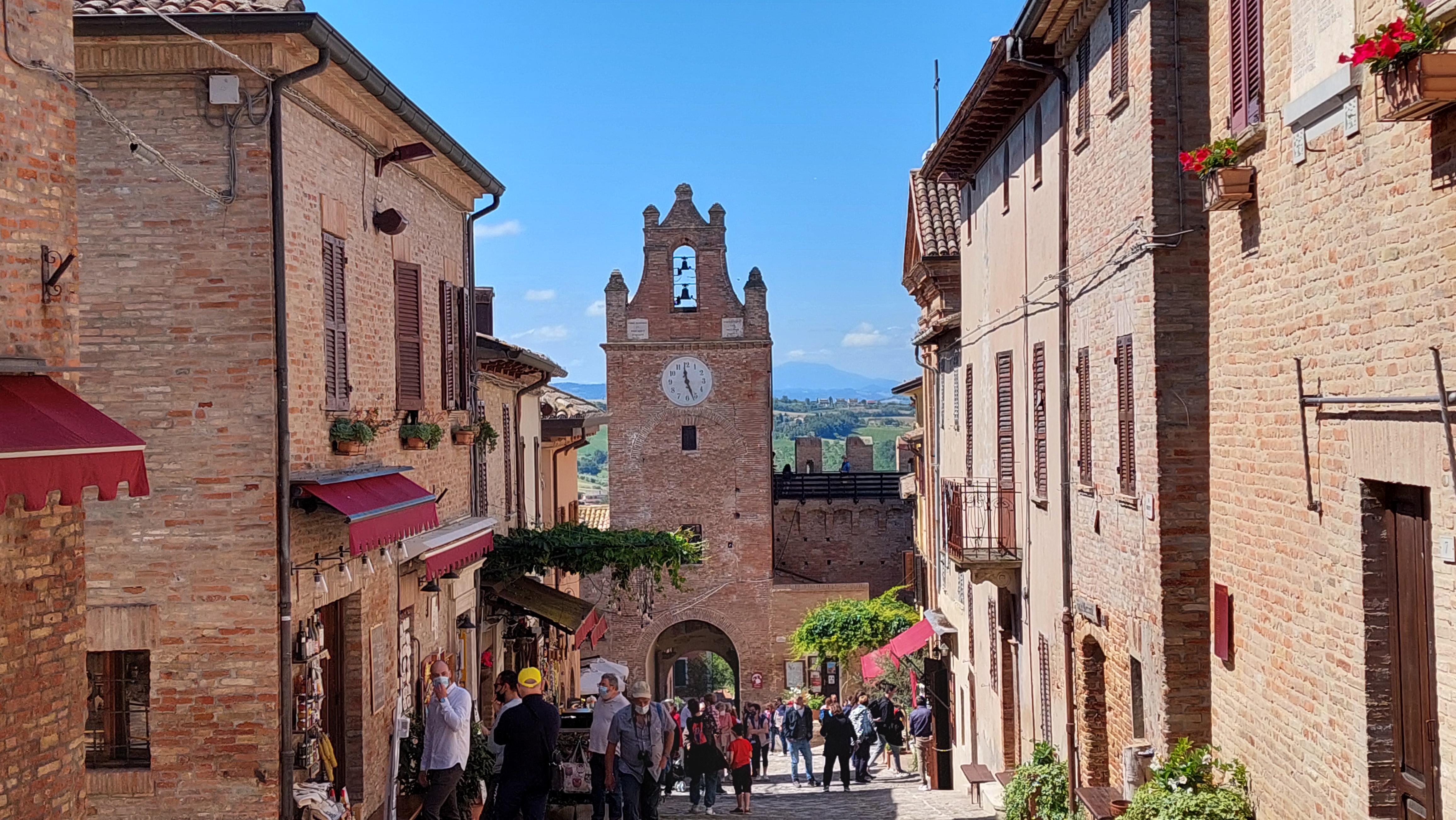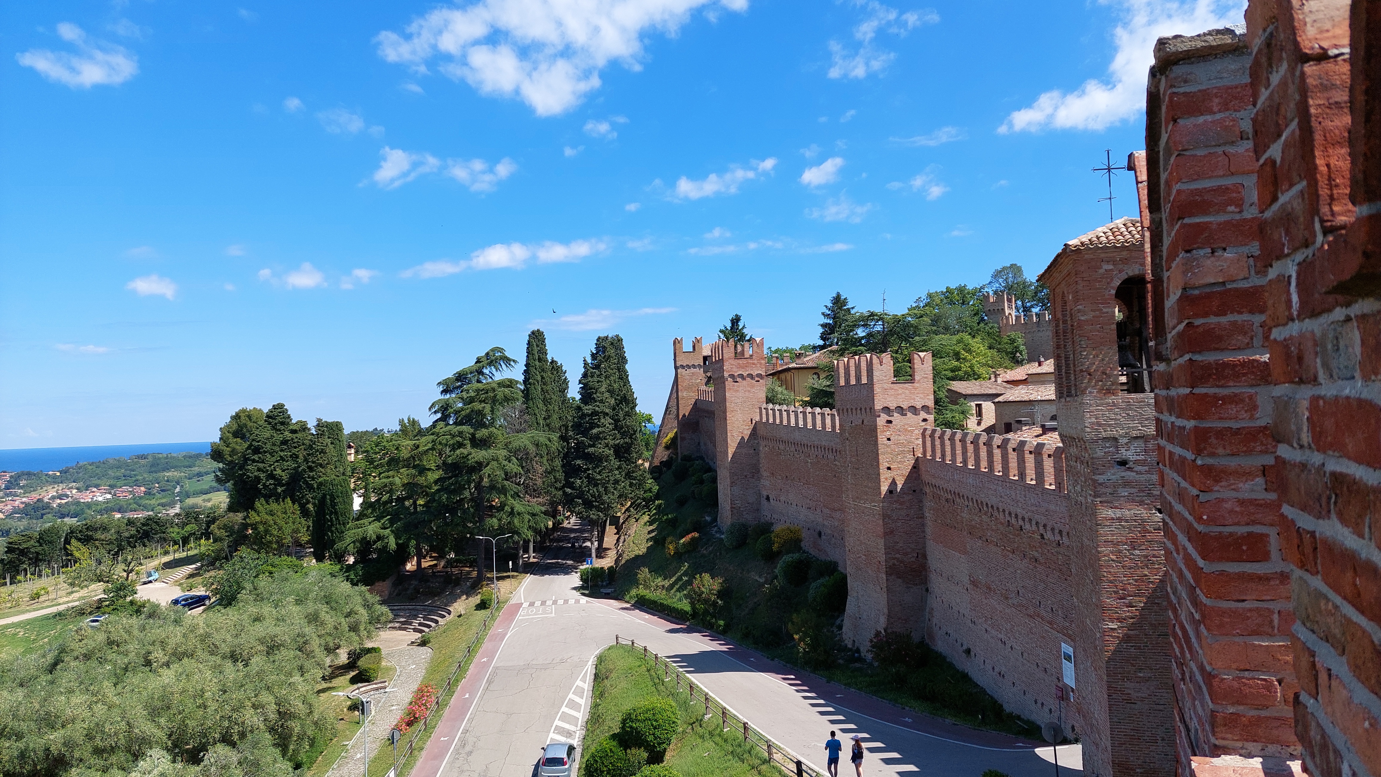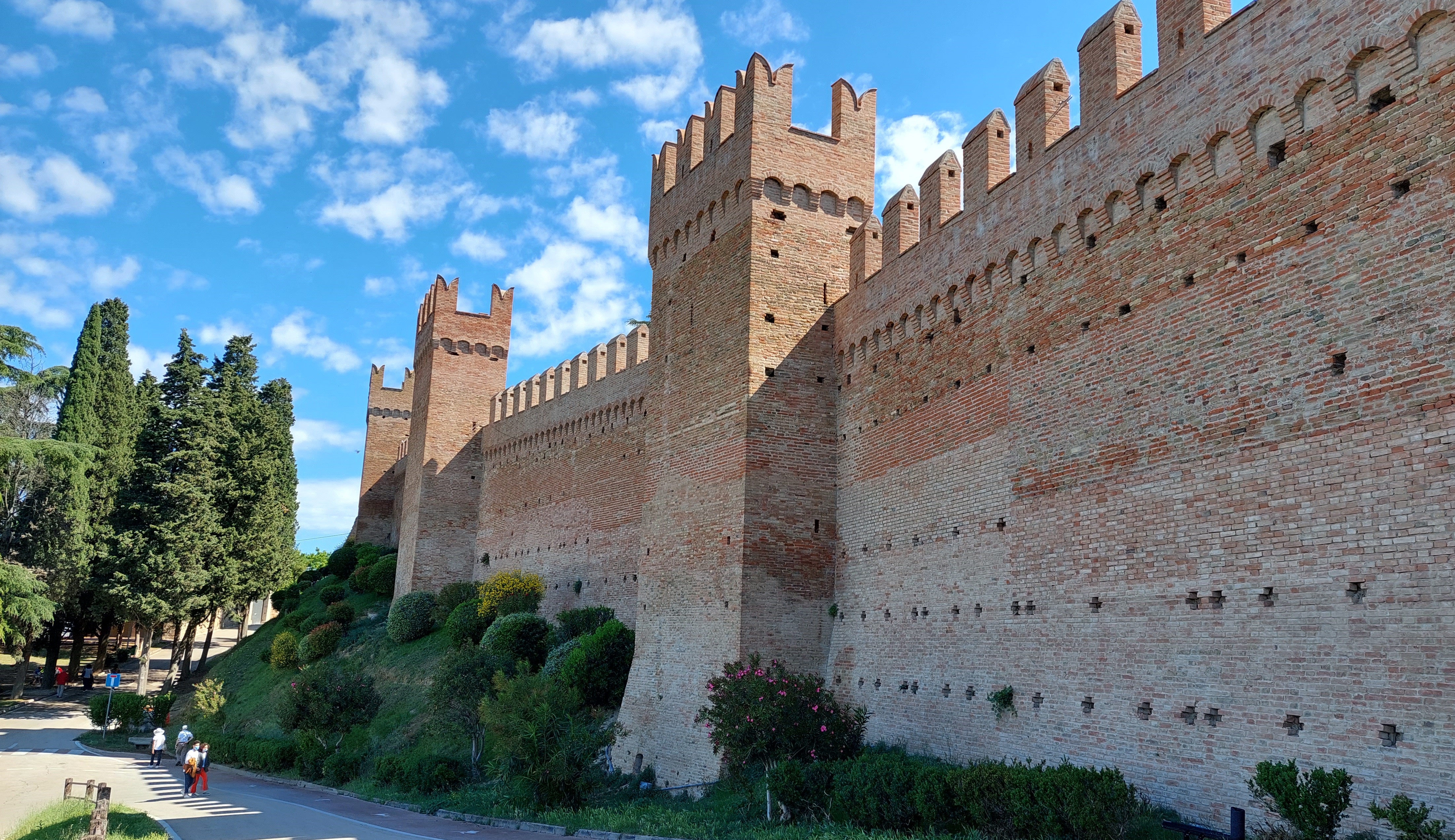 Średniowieczna Gradara zamknięta murami obronnymi jest dzisiaj niezwykle przyjemnym miasteczkiem na spokojny spacer. Główna ulica Via Umberto I łączy jedyny plac Piazza V Novembre z zamkiem. Wejście do miasteczka prowadzi przez Bramę Zegarową obok której znajduje się Biuro Informacji Turystycznej oraz kasa biletowa dla chętnych na przechadzkę po murach. Warto się tam wspiąć, bo widoki na miasteczko i na okolicę są przepiękne (a cena niewielka – bilet normalny 2 euro, bilet ulgowy 1 euro, dzieci poniżej 10 lat – gratis). Szeroka panorama wzgórz Emilii Romanii i Marche, malutkie domki porozrzucane wśród różnokolorowych pól i łąk, migoczące wstęgi dróg i Autostrady A14, w oddali Morze Adriatyckie, a pod nami czerwone dachy borgo nad którymi czuwa twierdza czyli Castello di Gradara. Mury obronne, które otaczają na całej długości Gradarę mają niecały kilometr długości, ale dodają miasteczku siły i godności.