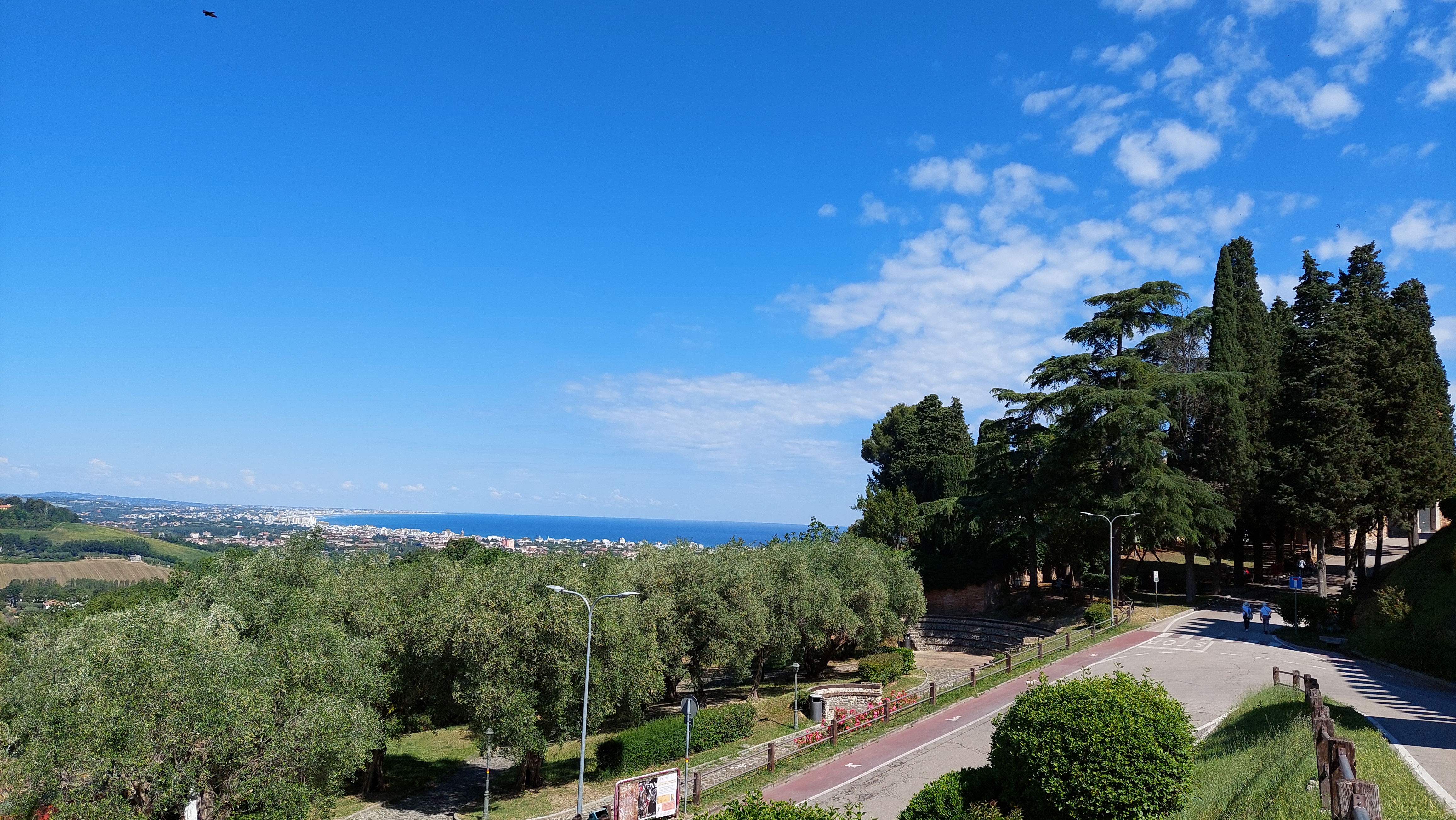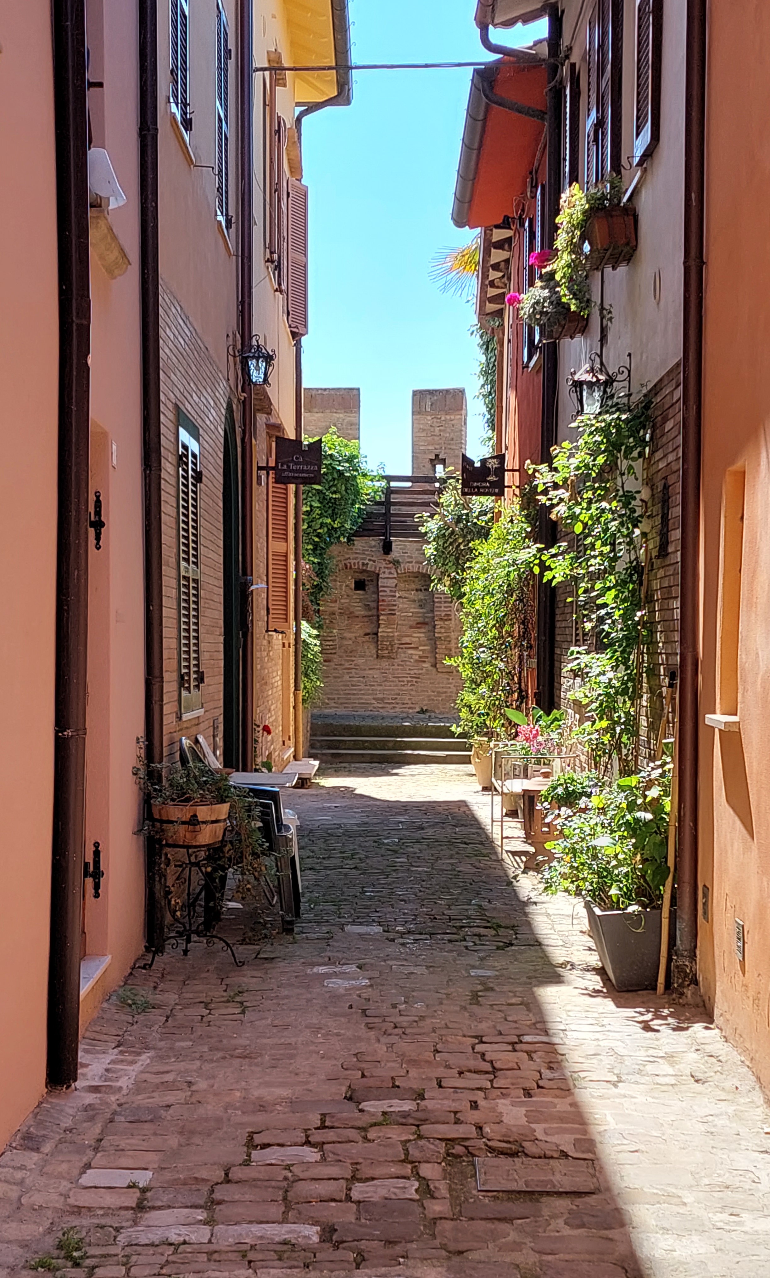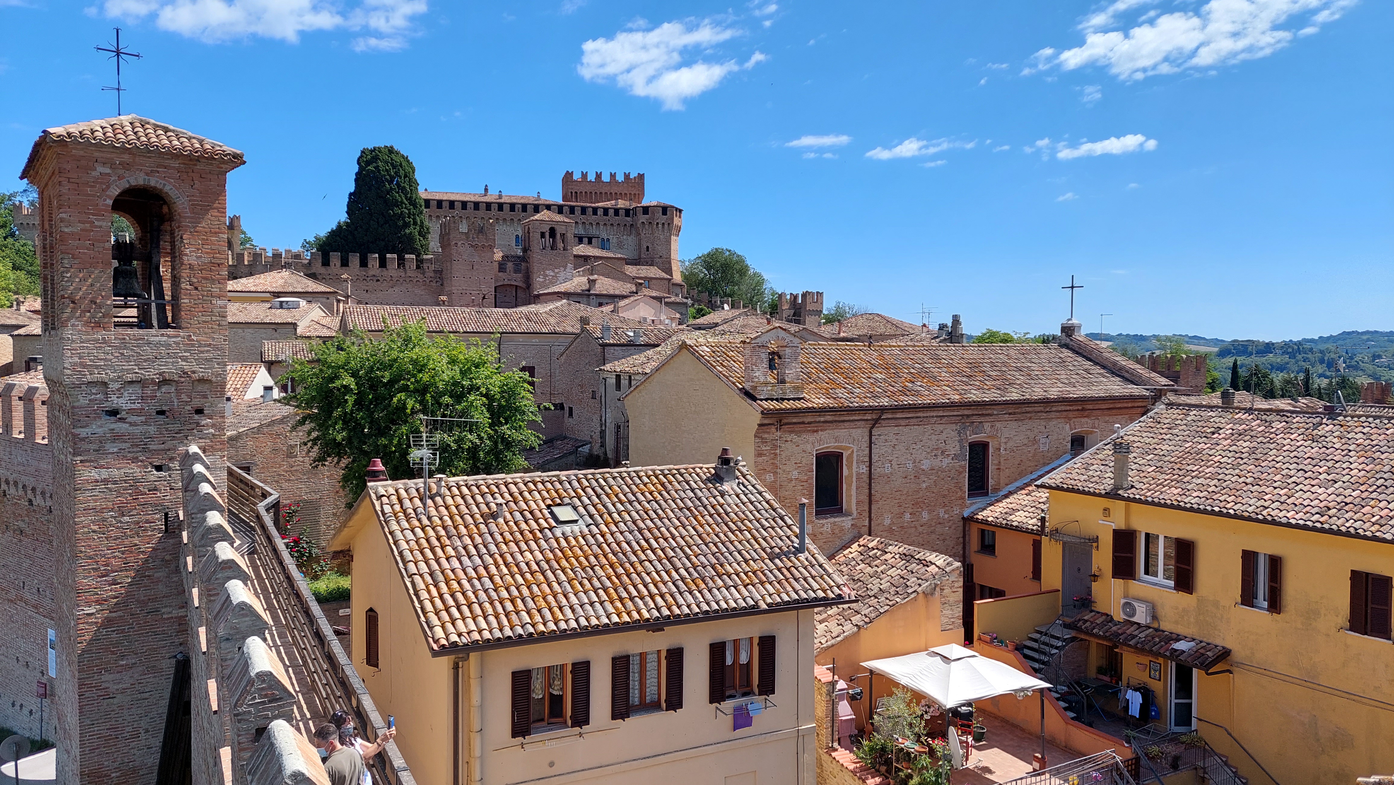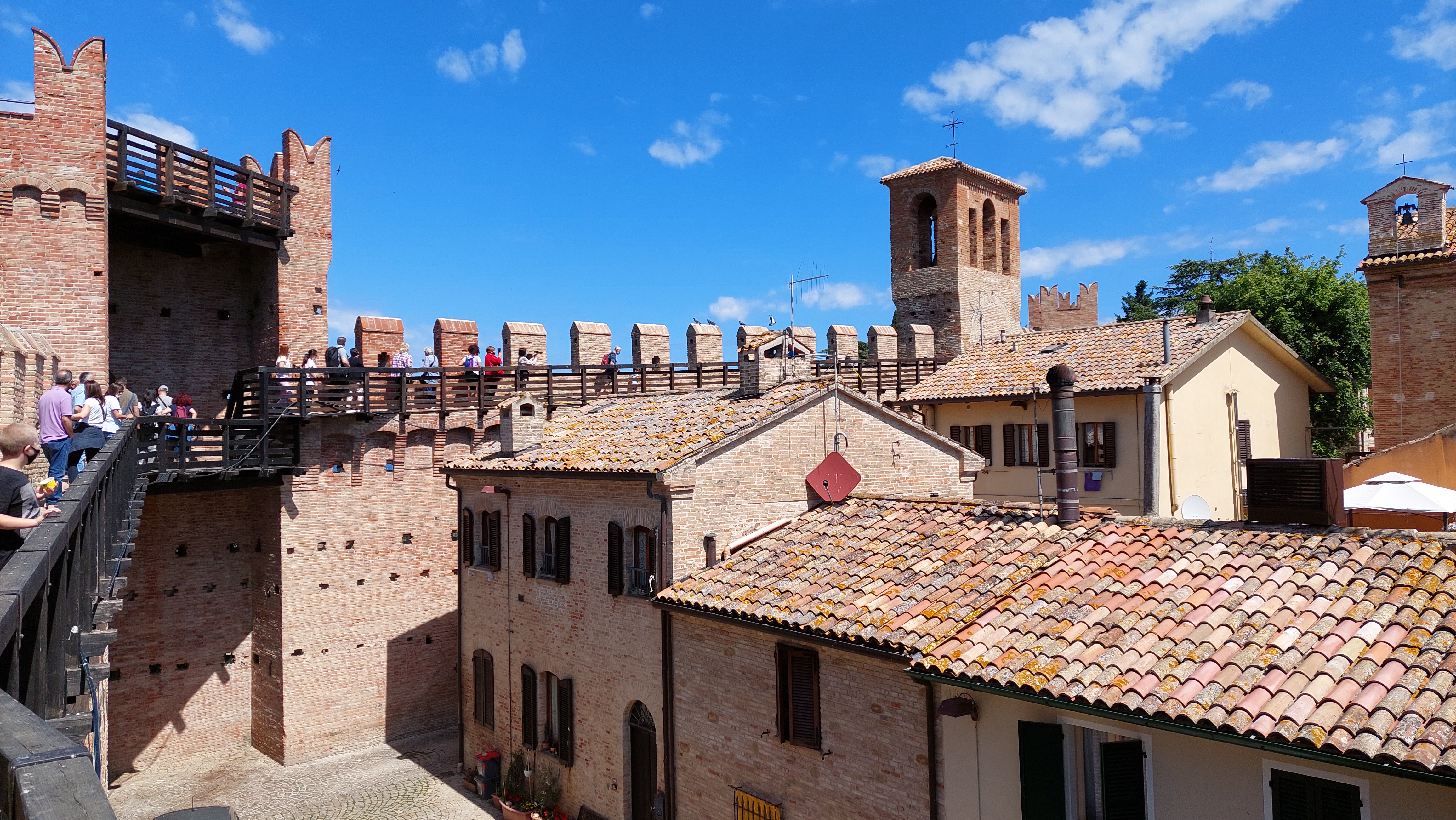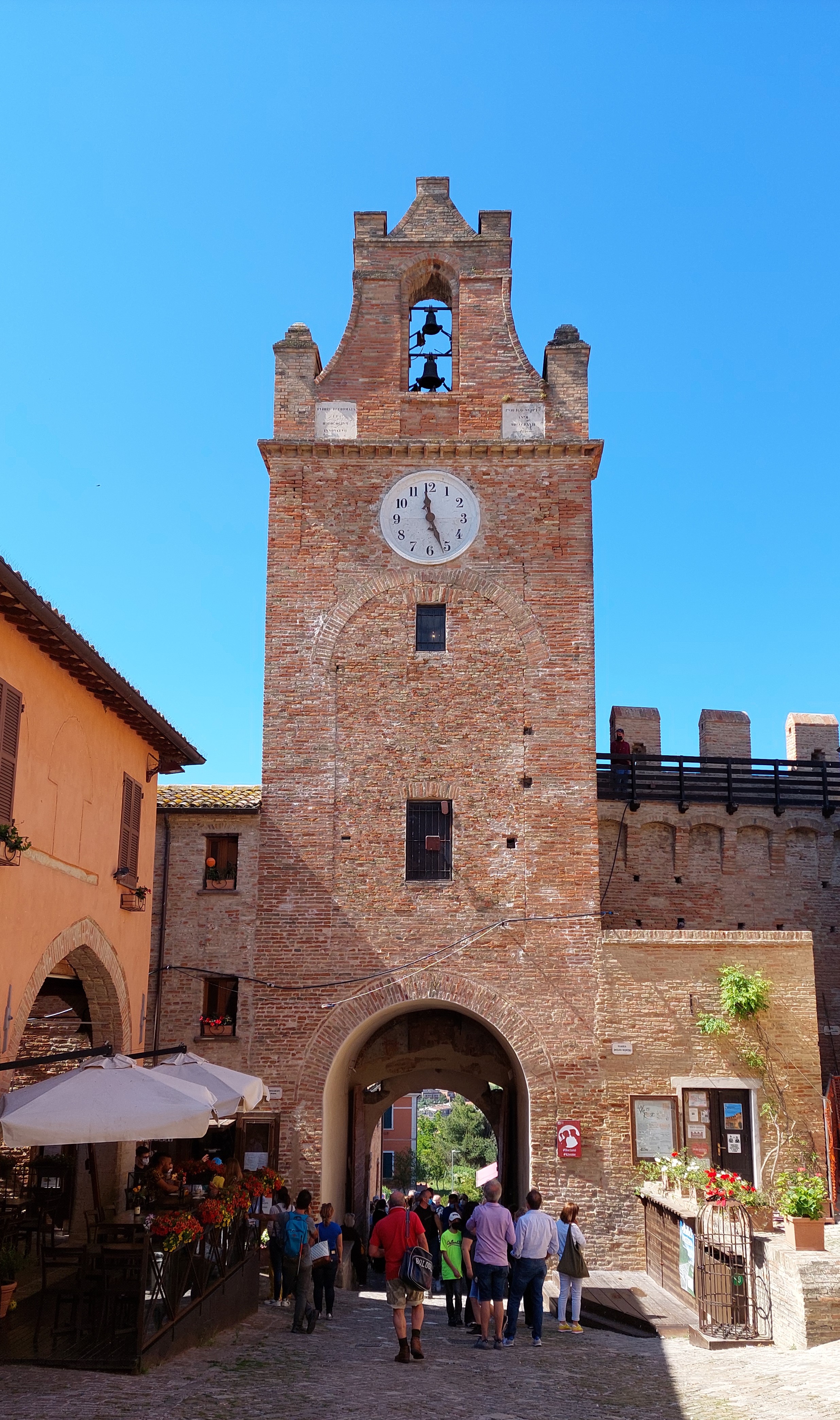 Średniowieczna Gradara zamknięta murami obronnymi jest dzisiaj niezwykle przyjemnym miasteczkiem na spokojny spacer. Główna ulica Via Umberto I łączy jedyny plac Piazza V Novembre z zamkiem. Wejście do miasteczka prowadzi przez Bramę Zegarową obok której znajduje się Biuro Informacji Turystycznej oraz kasa biletowa dla chętnych na przechadzkę po murach. Warto się tam wspiąć, bo widoki na miasteczko i na okolicę są przepiękne (a cena niewielka – bilet normalny 2 euro, bilet ulgowy 1 euro, dzieci poniżej 10 lat – gratis). Szeroka panorama wzgórz Emilii Romanii i Marche, malutkie domki porozrzucane wśród różnokolorowych pól i łąk, migoczące wstęgi dróg i Autostrady A14, w oddali Morze Adriatyckie, a pod nami czerwone dachy borgo nad którymi czuwa twierdza czyli Castello di Gradara. Mury obronne, które otaczają na całej długości Gradarę mają niecały kilometr długości, ale dodają miasteczku siły i godności.